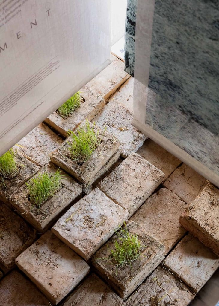 Avec ses élèves, Rami Zurayk, professeur de gestion des écosystèmes à l’Université Américaine de Beyrouth (UAB), a fabriqué les briques pour le pavillon. « La création de ces briques faite de la Terra Rosa, terre rouge du sud du Liban qui selon la légende a été colorée par le sang d’Adonis, accompagnée des autres articles, amène une réflexion intéressante. Ils lient entre eux la mythologie de la région à son paysage », précise le professeur. D’après la mythologie, Adonis, jeune dieu de la beauté et de la fertilité, était aimé d’Astarte (Aphrodite). Il aurait été tué par un sanglier dans les montagnes du Liban, près du fleuve aujourd’hui appelé Nahr Ibrahim. Son sang se serait alors déversé dans le fleuve qui se jette dans la Méditerranée. Lorsque les pluies entrainent la terre rouge dans les eaux du fleuve, les anciens y voient le sang d’Adonis se déverser sur la terre, symbole de renouveau et de fertilité. La Terra Rosa, terre ferrugineuse caractéristique du sud du Liban, est chargée d’une forte symbolique mythologique et écologique car elle représente la continuité entre la culture, la nature et la mémoire. Le paysage du sud du Liban porte les traces de ce mythe. Avec l’utilisation de cette terre pour fabriquer les briques du pavillon, Rami Zurayk et ses étudiant·es relient la symbolique antique du sang d’Adonis à la réalité écologique contemporaine du Sud-Liban — une région reconnue pour la beauté de ses sols, mais aussi marquée par les blessures de la guerre. Rami Zurayk a également rédigé plusieurs articles sur la pollution des sols, le paysage du sud du Liban et les produits agricoles qui constituent la mosaïque du pays, du nord au sud.