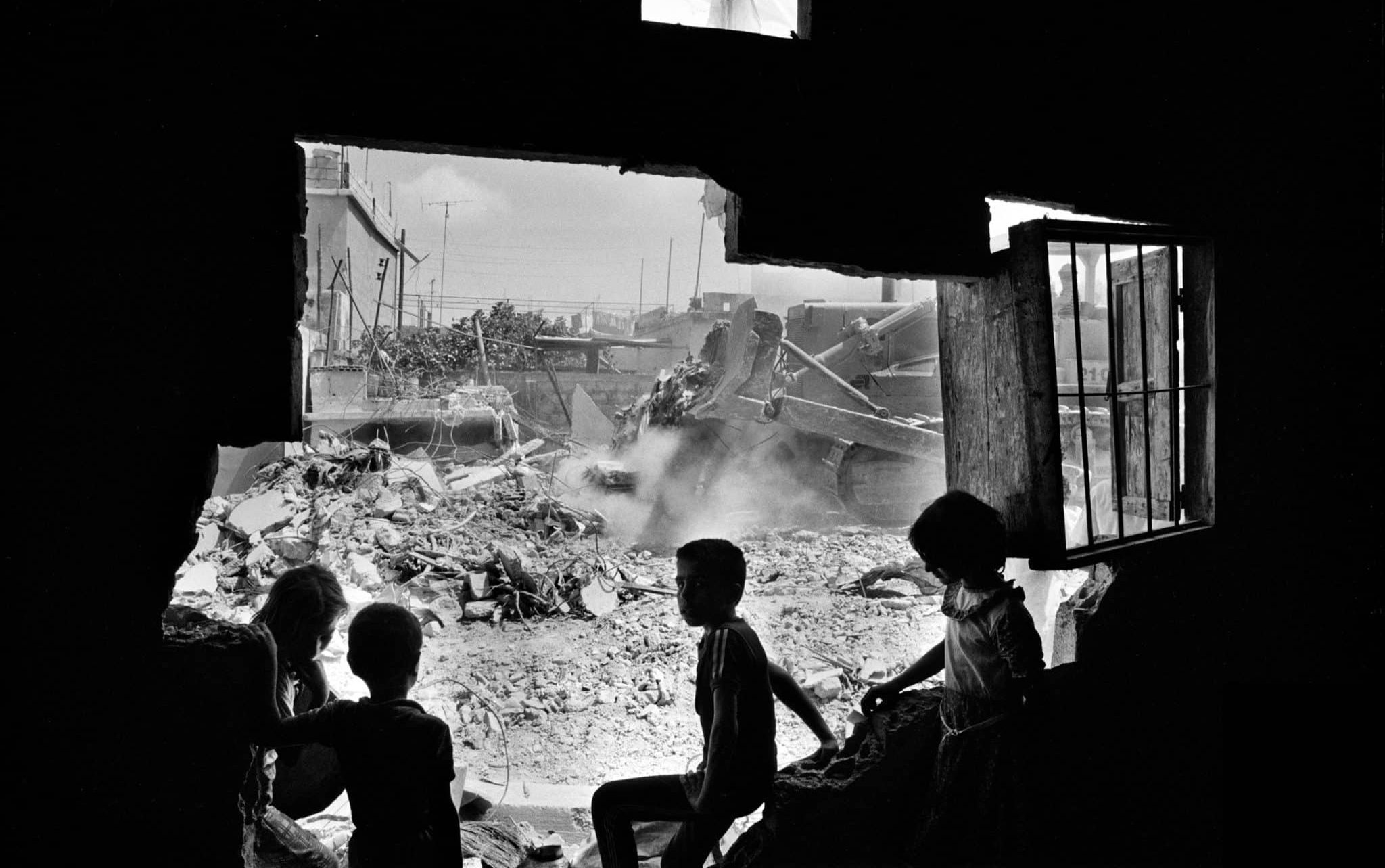 Photo de couverture · UNRWA · Des enfants réfugiés palestiniens regardent un bulldozer israélien démolir les derniers vestiges d’un abri détruit dans le camp d’Ein El Hilweh, au Liban · 1982