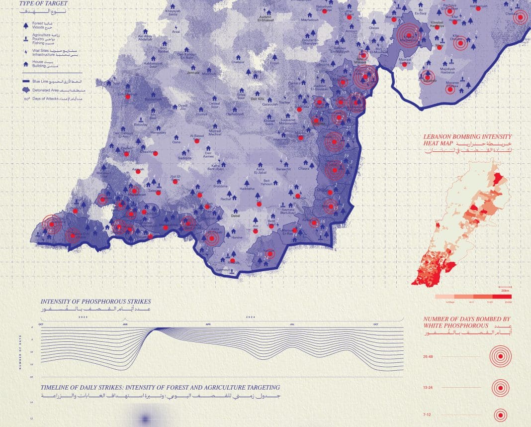 Les bombardements massifs de l’armée israélienne au Liban ne tuent pas seulement des civil·es, ils ravagent aussi les terres et le vivant. À l’occasion de la Biennale de Venise, un collectif d’architectes libanais·es se mobilise et conçoit un pavillon à partir des données récoltées sur le terrain par des bénévoles et des chercheur·ses. Reportage.