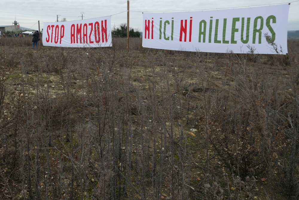Le samedi 30 janvier 2021, nous étions plus d'un millier à nous rassembler dans un champ de Fournès (Gard), pour protester contre l'implantation d'un hangar Amazon géant (40 000 m2 pour 18 m de hauteur) à l'invitation d'un collectif d'associations (Attac, Les amis de la Terre, Extinction rebellion, ANV-Cop21, Adere, la Conf', etc).